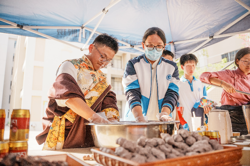 飘着青稞和酥油茶香的美食,让西藏文化展示区人气爆棚,摊位前排起了长龙。西藏班的学生们现场制作糌粑和酥油茶。“很多同学来品尝,他们都对西藏文化很有兴趣。”正在读高一的普布卓嘎告诉记者,来到