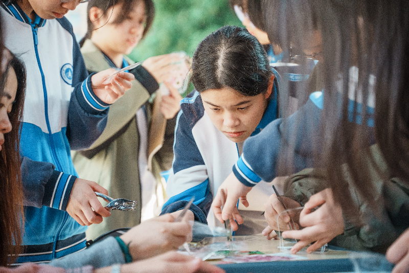 生物学科的摊位带来了许多精致的书签。学生们将收集的树叶压平再塑封,串上绳子,便制成了独一无二的书签。来自高三的小涵做完书签后将其夹在自己的课本里,“马上就要毕业了,书签就当是给自己的毕业礼物吧。”