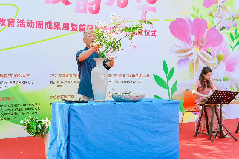 活动现场,经典潮剧《游园》的演员身着华服,将古典故事演绎得细腻入微,让观众触摸到了传统文化的温度;学生群体朗诵《仪花韵里 青春书华章》,以诗意的语言表达了对仪花精神的赞美;岭南插花花艺大师、岭南插花非遗传承人马骁勇现场带来的艺术插花《青衿仪韵》更是将活动推向了高潮,他以仪花和蝴蝶兰为材,不仅展示花卉的美丽,更是对中式插花艺术的传承和弘扬。