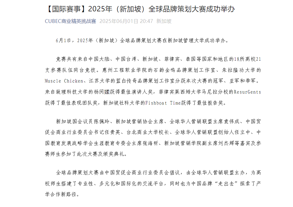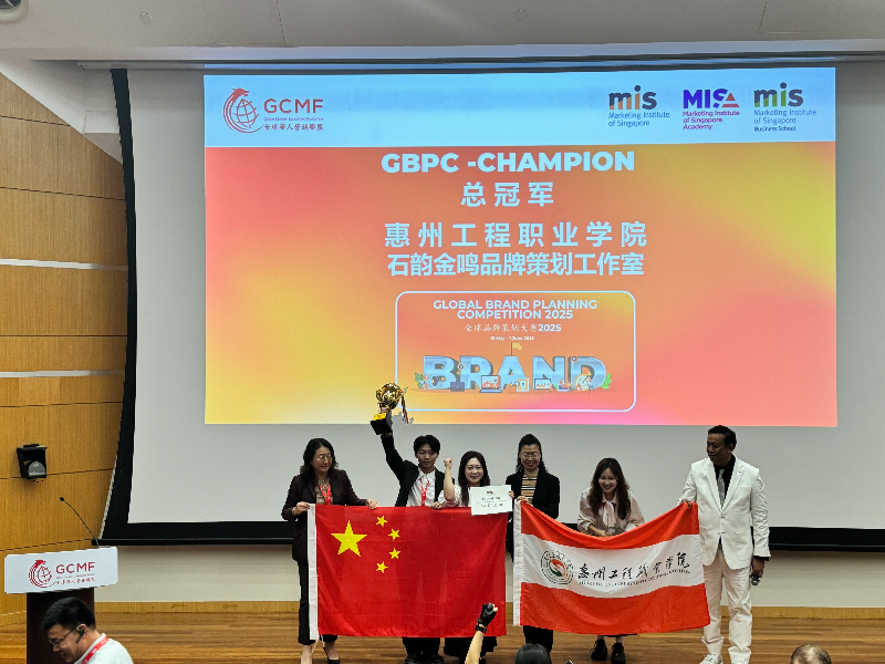 5月30日至6月2日,2025年全球品牌策划大赛在新加坡举行。在这场高手如云的国际赛事中,惠州工程职业学院代表队凭借卓越表现力压群雄,勇夺大赛总冠军!这一荣誉不仅是我市教育工作取得的又一丰硕成果,更为惠州本土品牌的推广以及农文旅融合发展贡献了宝贵的智慧与实践案例。