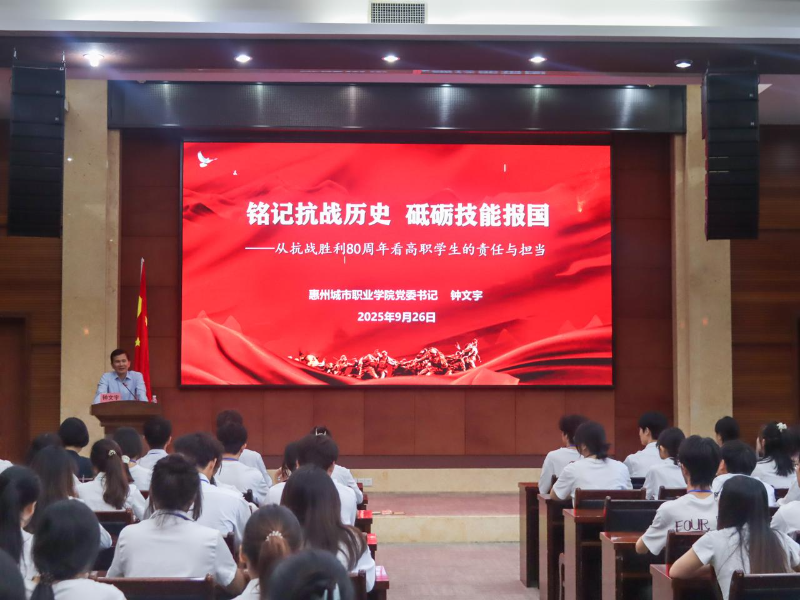 在惠州博物馆报告厅,钟文宇以《铭记抗战历史 砥砺技能报国——从抗战胜利80周年看高职学生的责任与担当》为题,为学生阐释“历史与当下、个体与时代、本领与担当”的内在逻辑:勿忘国耻,是对历史的直面与清醒;铭记历史,是对道路的坚定与自信;传承精神,是把信仰转化为行动的毅力;珍爱和平,是以发展守护家国的担当。迈向新征程,钟文宇对学子提出“坚定信念、练就本领、彰显担当”的殷切期望。